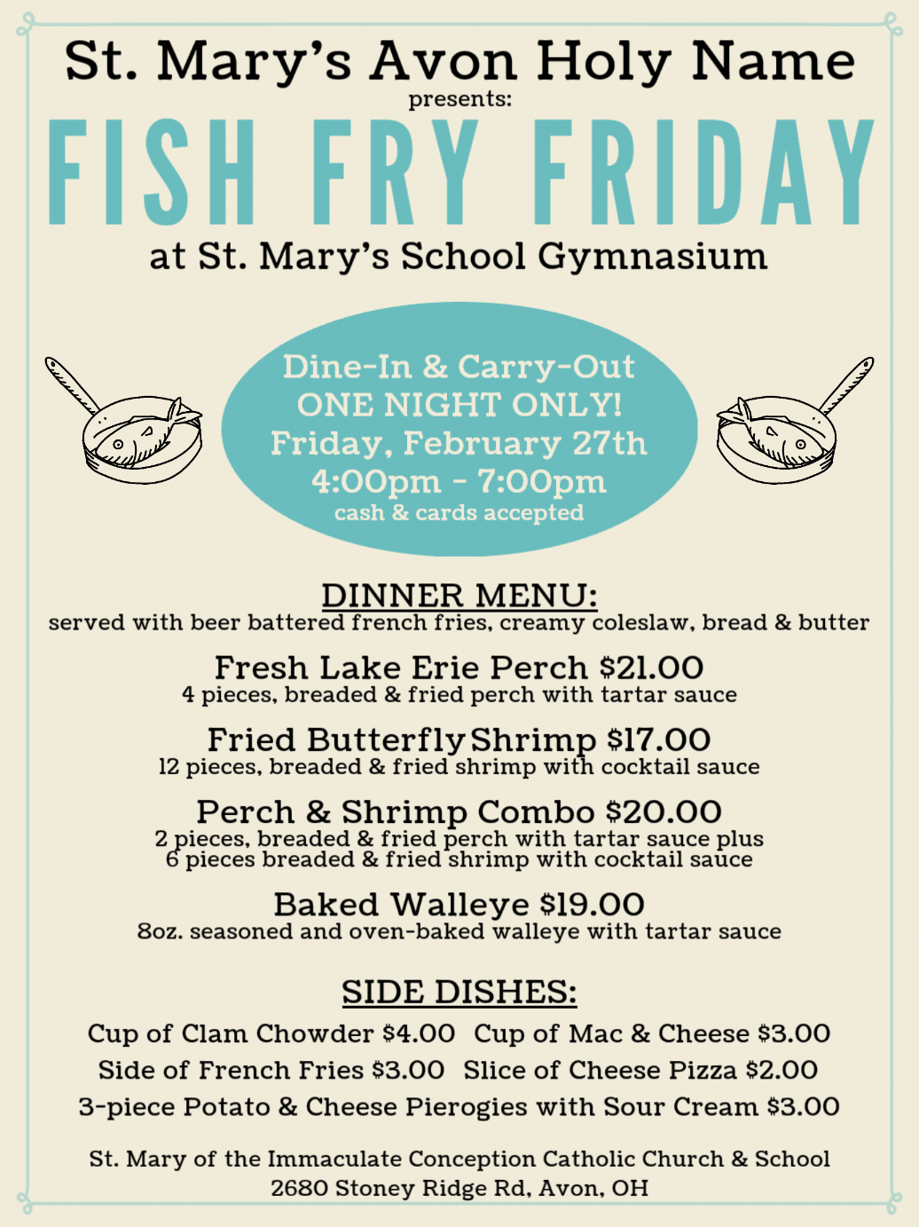 We’re helping our friends at St. Mary’s Church Avon with their annual lenten fish fry!